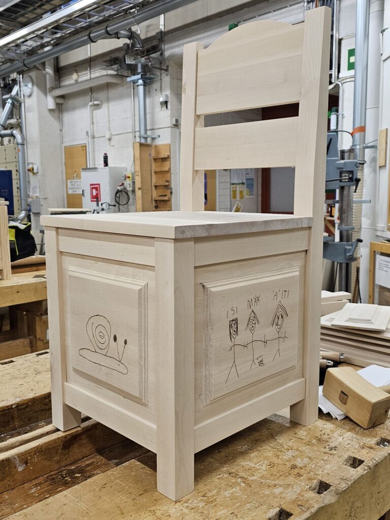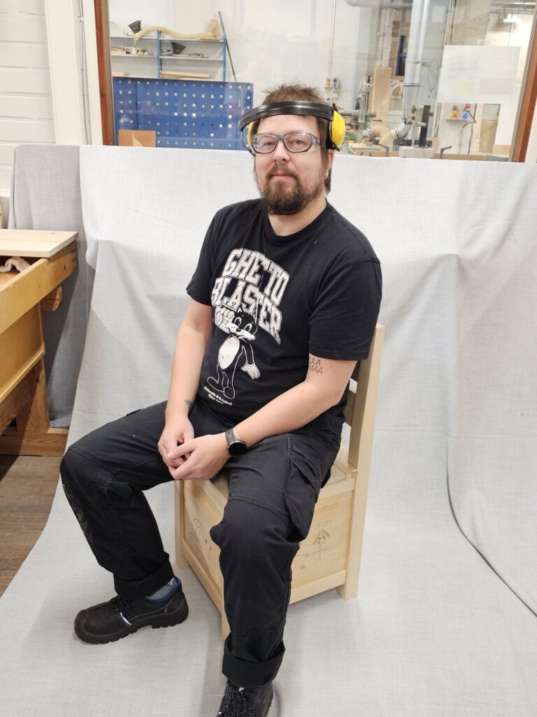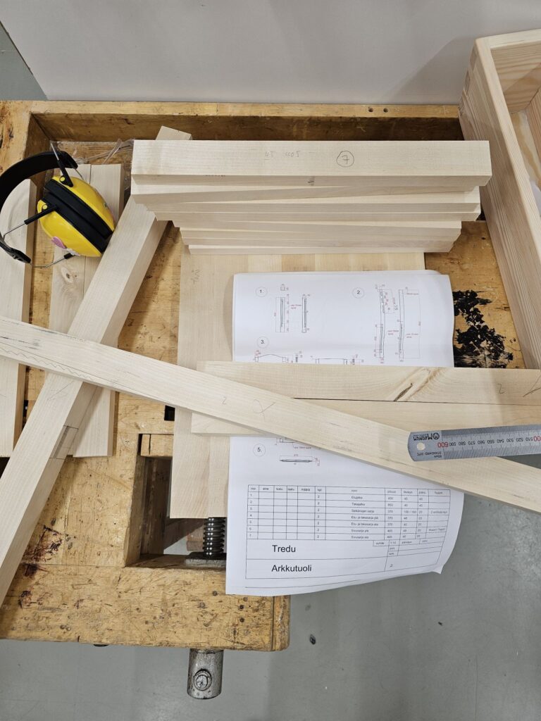 Aikaa tuolin tekemiseen meni jotain kuukauden ja kahden välistä, tarkoista tunneista en osaa sanoa, koska välillä oli odottelua, että muut saavuttaa saman pisteen ja meille opetetaan seuraava tarvittava kone. Välillä taas ei motivoinut esim hioa ja sitä tuli välteltyä tekemällä jotain sivuprojekteja pari päivää.